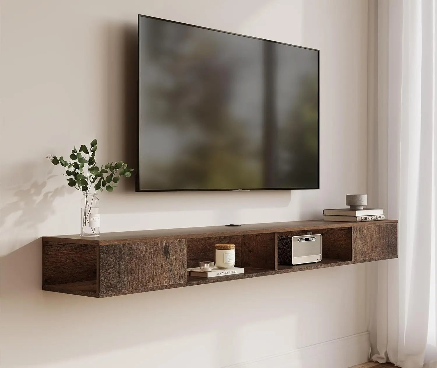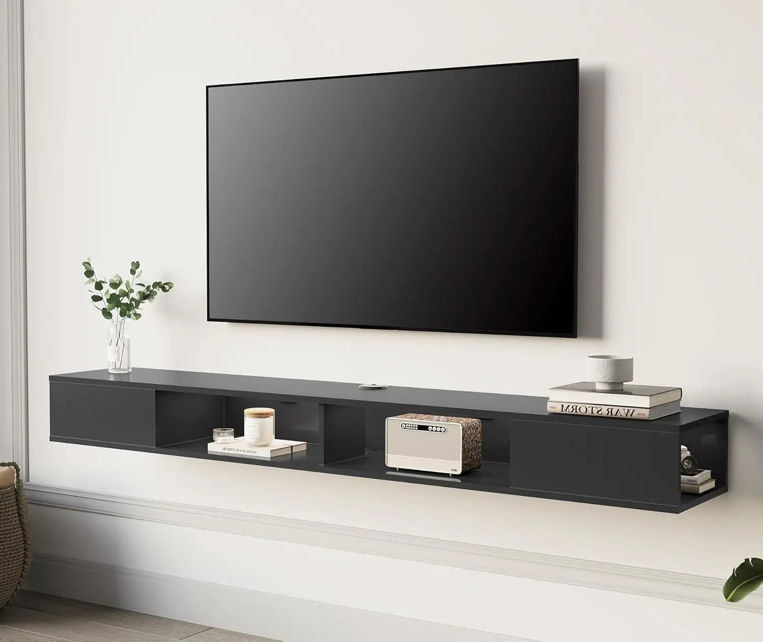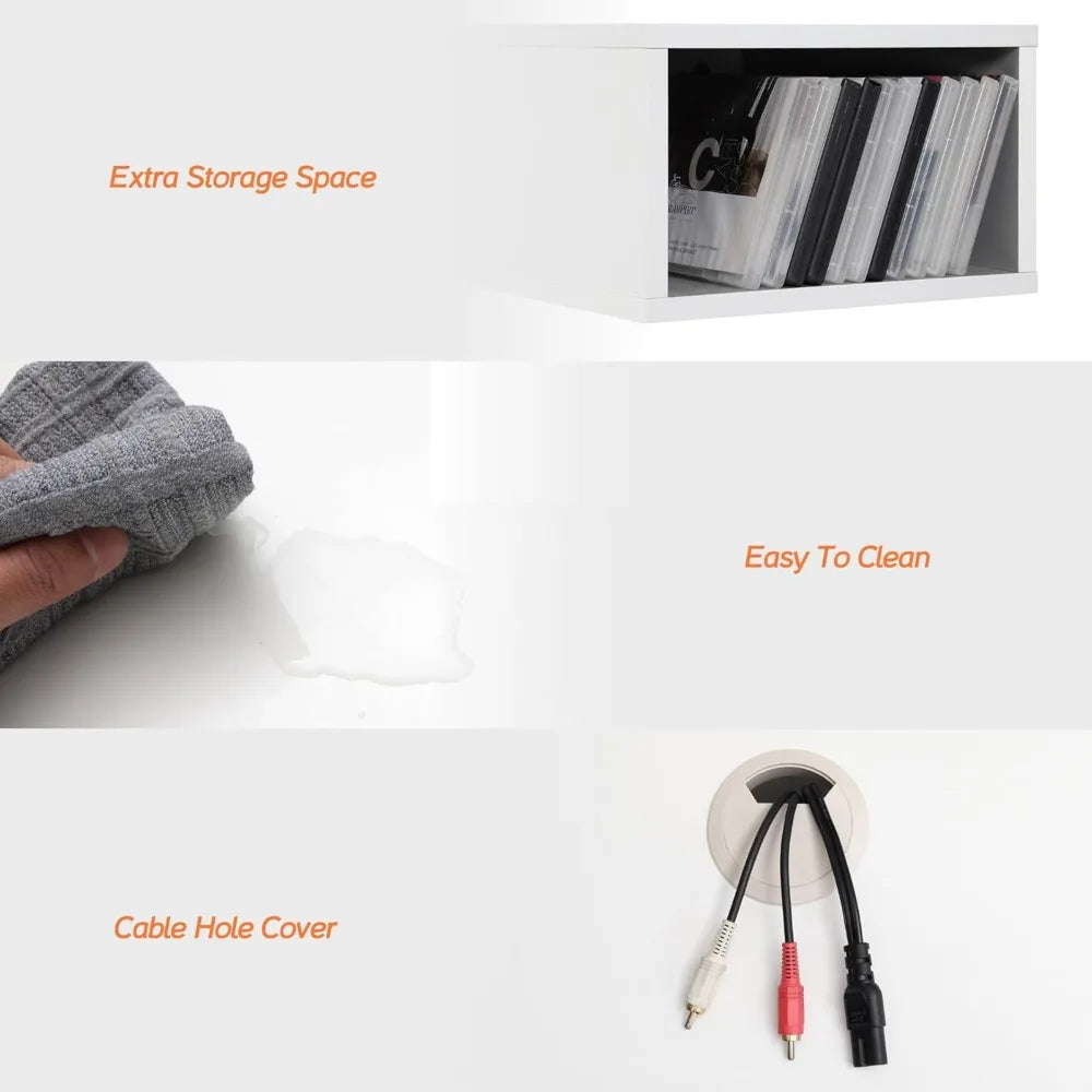 - 【SPACE SAVING】Wall mounted console shelf, Keep the floor space under your television clear by storing TV equipment on the media console's wall mounted shelves. Cable Holes for hiding messy wires keeping your stuff neatly organized and within reach!