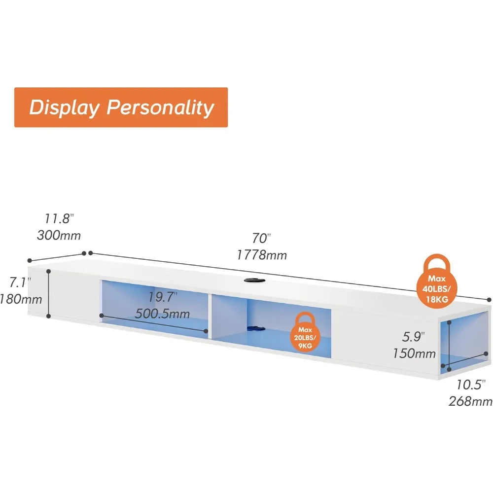 - 【LARGE STORAGE WITH LED LIGHTS】70" W x 11.8" D x 10.5" H with 16-color adjustable lights. This floating tv console is perfect for DVD player, CDs, projector cable box, game console, TV component and decorations, side compartments provide additional storage.